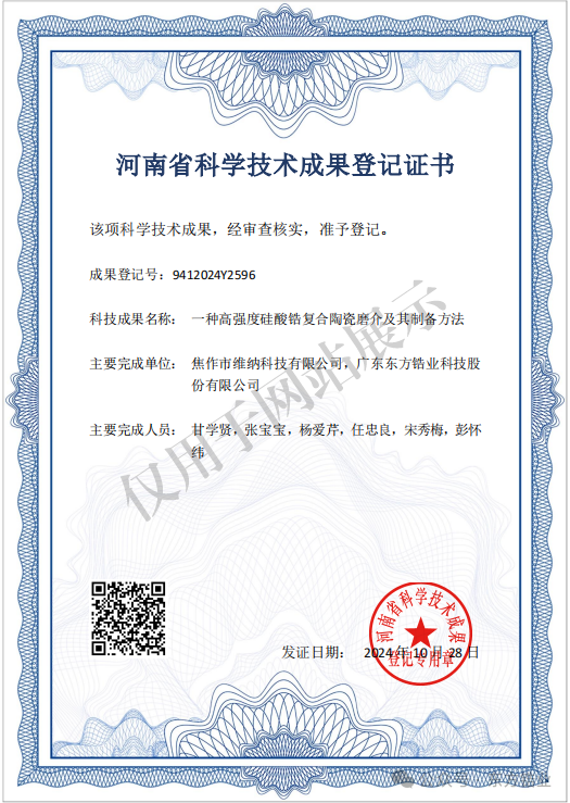 此次科技成果评价的成功通过,不仅是对公司科研实力的肯定,更是对公司在高强度硅酸锆复合陶瓷磨介领域创新能力的认可。未来,维纳将继续加大研发投入,推动科技成果转化,为推动我国陶瓷材料产业的发展做出更大的贡献。同时,该项目成果已经过河南省科技厅的认定登记。